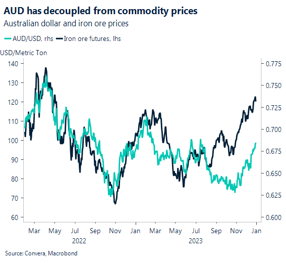 Iron ore reached 18-month highs this week and the Australian dollar remains the likely winner from any potential China GDP upgrade in 1H24. But for now, the AUD seems more disconnected from iron ore prices.