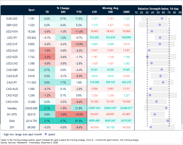 In foreign exchange markets, after the weaker than expected US ADP report, the Canadian dollar has firmed to 1.395, supported by a weaker U.S. dollar and a stronger-than-expected Q3 GDP print. Attention now turns to Friday’s November employment report, the key domestic data release of the week.