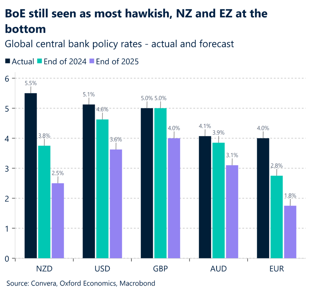 In particular, market expectations for the euro have shifted markedly, with market pricing looking for the European Central Bank deposit rate to fall from 4.00% currently to 2.80% at the end of 2024. The market sees the ECB rate at 1.80% at the end of 2025.