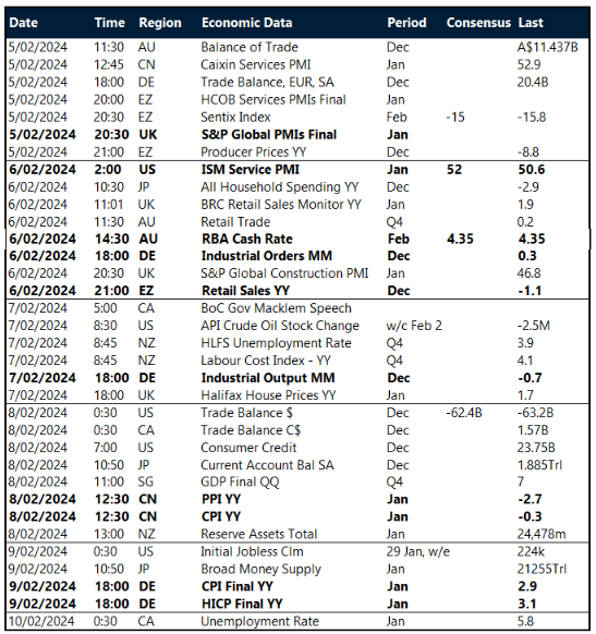 According to ASX, financial markets don’t see an RBA rate cut until August. Any delay to rate cuts in Australia – especially as speculation swirls around potential cuts in the US and Europe –might support the AUD.