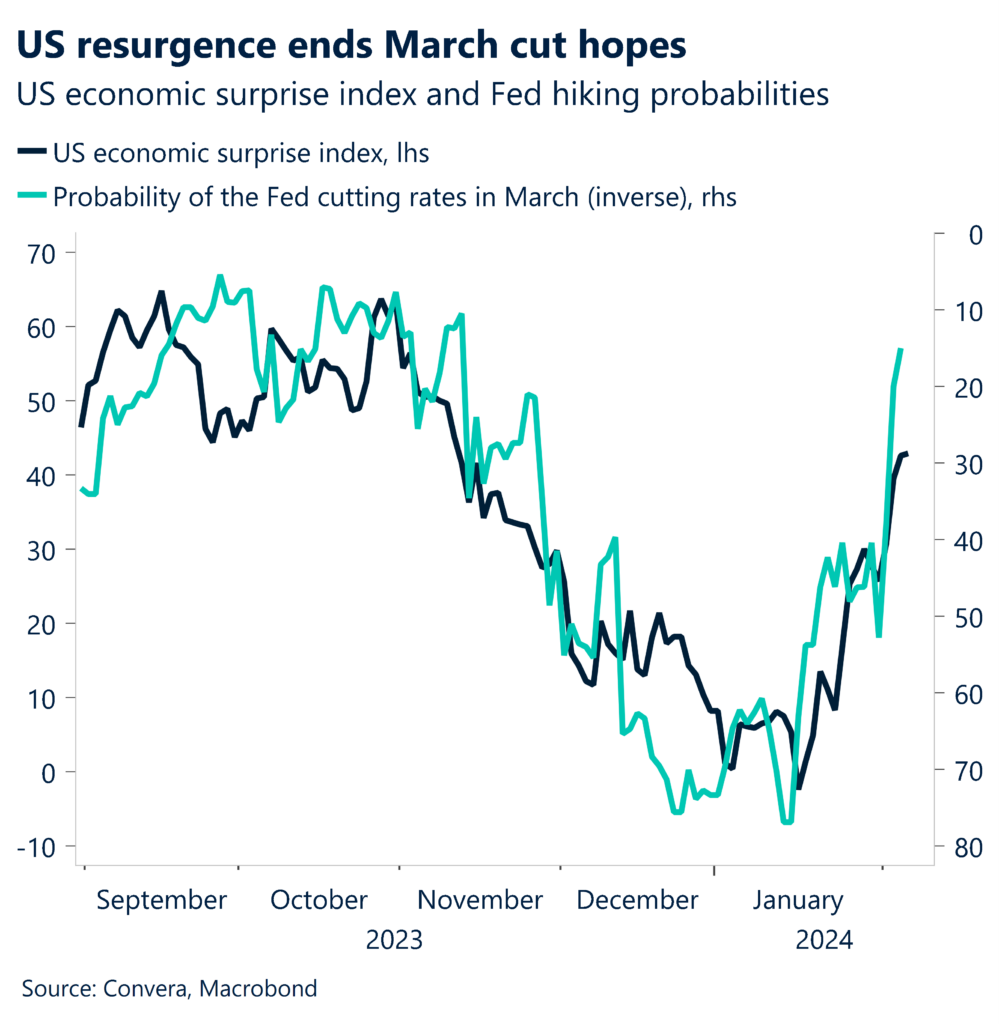 The US dollar eased back from three-month highs overnight following a strong rally in recent days sparked by a bumper jobs report and hawkish commentary from Federal Reserve chair Jerome Powell. More broadly, US data has seen a strong resurgence in 2024 so far.
