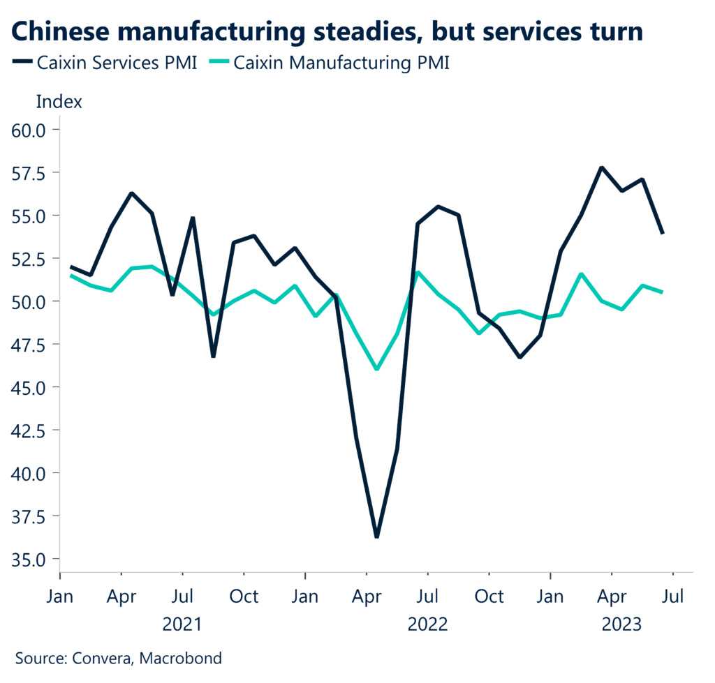While Chinese manufacturing has recently underperformed, services, like travel, education and entertainment, had been well supported as China emerged from its 2022 lockdowns.