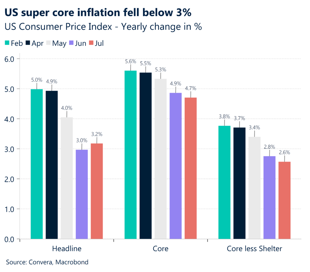 But it was the core numbers that sparked hope the Federal Reserve has contained inflation. Core inflation in annual terms fell from 4.9% in June to 4.7% – below forecasts for 4.8% – while “super core” which removes shelter fell to 2.6%.