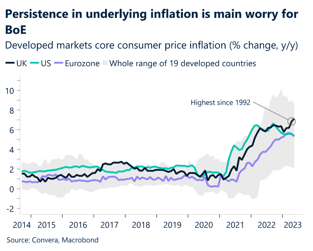 The British pound was the main focus, weaker versus the US dollar but stronger in most other markets, after the Bank of England raised rates by 50 basis points to 5.00%. Before the release, the market had seen a 25bps hike as most likely.