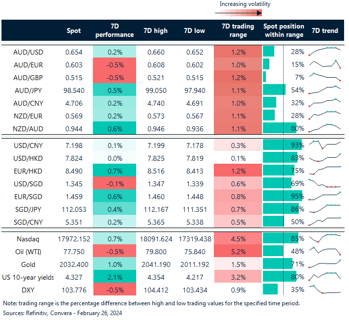 Global stock markets stretched to fresh record highs last week, bonds were sold off and US yields touched fresh three-month highs. However, FX has detached somewhat from rate spreads recently, with the US dollar index recording its firstly weekly fall of 2024 as investors took a breather after reducing bets for future Federal Reserve (Fed) rate cuts.