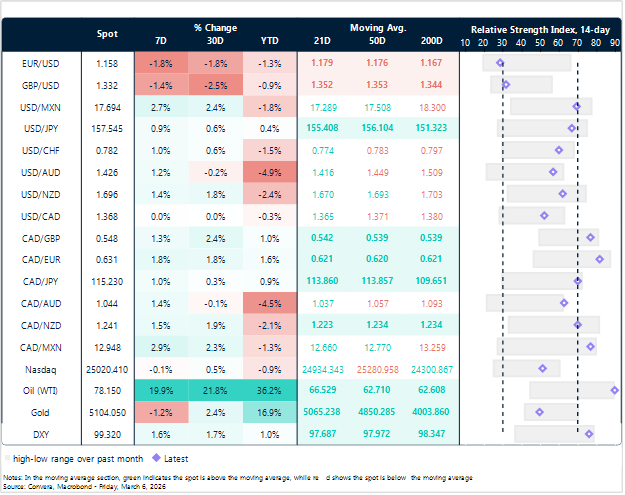 Within FX, a clear energy led split has opened: the USD is outperforming even traditional havens, oil/energy sensitive importer countries have struggled, while commodity FX is well supported. Notably, the CAD has been comparatively resilient, suggesting terms of trade support is offsetting, not erasing, the broader USD surge. A sticky oil risk premium plus safe haven demand is to keep the USD bid, while the CAD’s relative outperformance hints at a more nuanced energy impulse beneath the headline move. Today’s US NFP report caps USD advancement, leaving the CAD positioned to trade lower to end the week, any further upside for the Greenback likely depends on a worsening conflict in Iran and subsequent safe-haven demand.