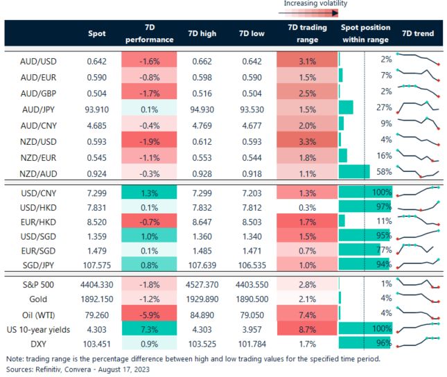 This week’s lower than expected Chinese industrial production and retail sales numbers saw key regional FX markets like the Chinese yuan and Australian dollar heavily sold. A decision from China’s National Bureau of Statistics to suspend the publication of youth unemployment figures, after they last reached 21.3% in June, also spooked markets.