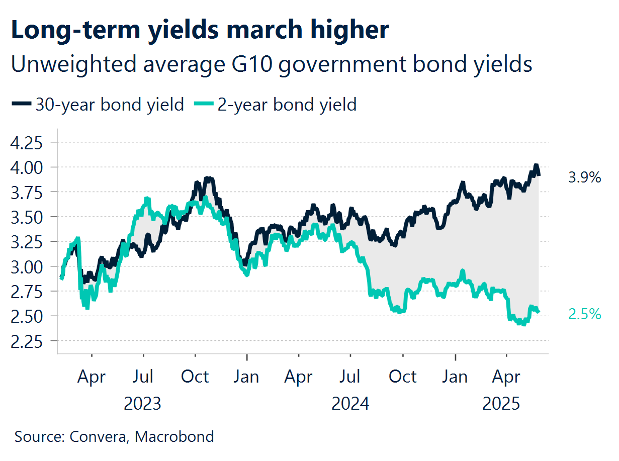 Bond markets appear to be in retreat globally, not just in the US. Yields on Japan’s 40-year bonds and the UK’s 30-year bonds are near multi-decade highs. The sharp rise in long-term yields is typically a sign of optimism but is now more reflective of fiscal concerns which are driving the dollar’s depreciation.