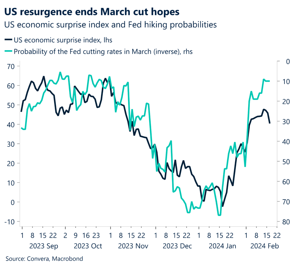 March cut “off the table”. Financial markets have finally accepted that a March rate cut in the US is unlikely to occur. The probability of a Federal Reserve rate cut in March has fallen from near 80% at the start of the year to 10% by mid-February (source: CME FedWatch). After Fed chair Jerome Powell pushed back on expectations earlier this month, this week’s hotter than expected US inflation report was the final nail in the coffin.