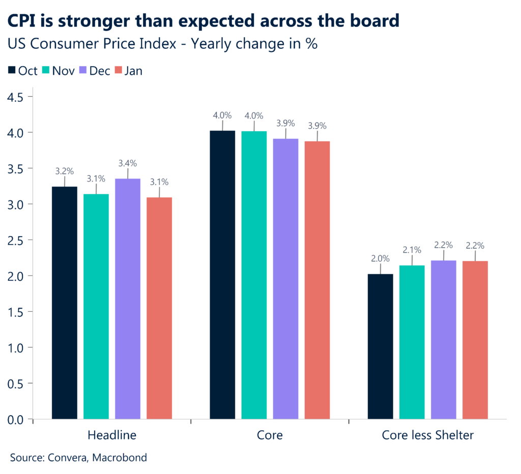 Inflation bubbles back. The US dollar hit three-month highs after a hotter-than-expected January inflation report ended most hopes for a March rate cut from the US Federal Reserve. Headline annualised CPI was reported at 3.1% — above expectations for 2.9%. Core annualised CPI was 3.9% versus 3.7% expected. Worryingly, short-term inflation measures (i.e one- and three-month annualised) have seen an ongoing shift higher since mid-2023.