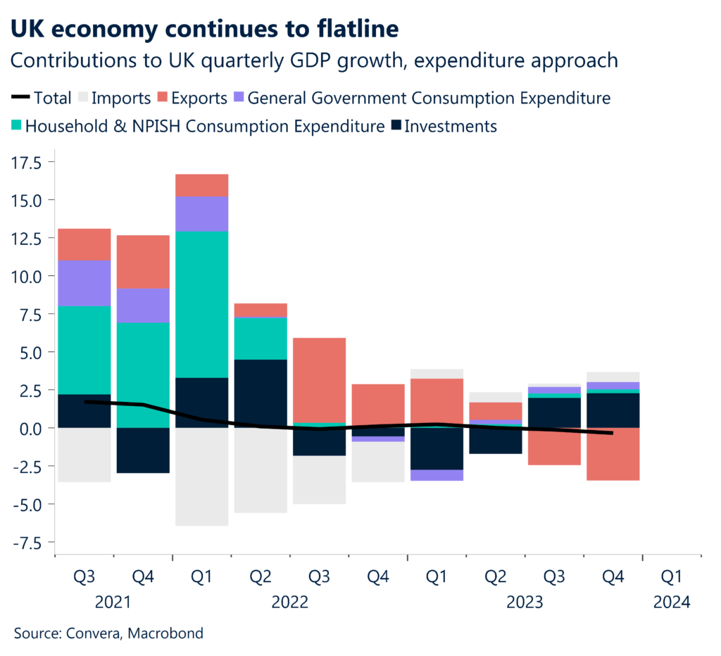 UK data drives volatility. The British pound was initially supported by a better result from Tuesday’s unemployment result (at 3.8% in January versus 4.0% forecast) and stronger wages growth (at 5.8% versus 5.6% expected). However, on Wednesday, a weaker inflation result weighed on the GBP followed by confirmation on Thursday the UK economy had fallen into a recession in the second-half of 2023.