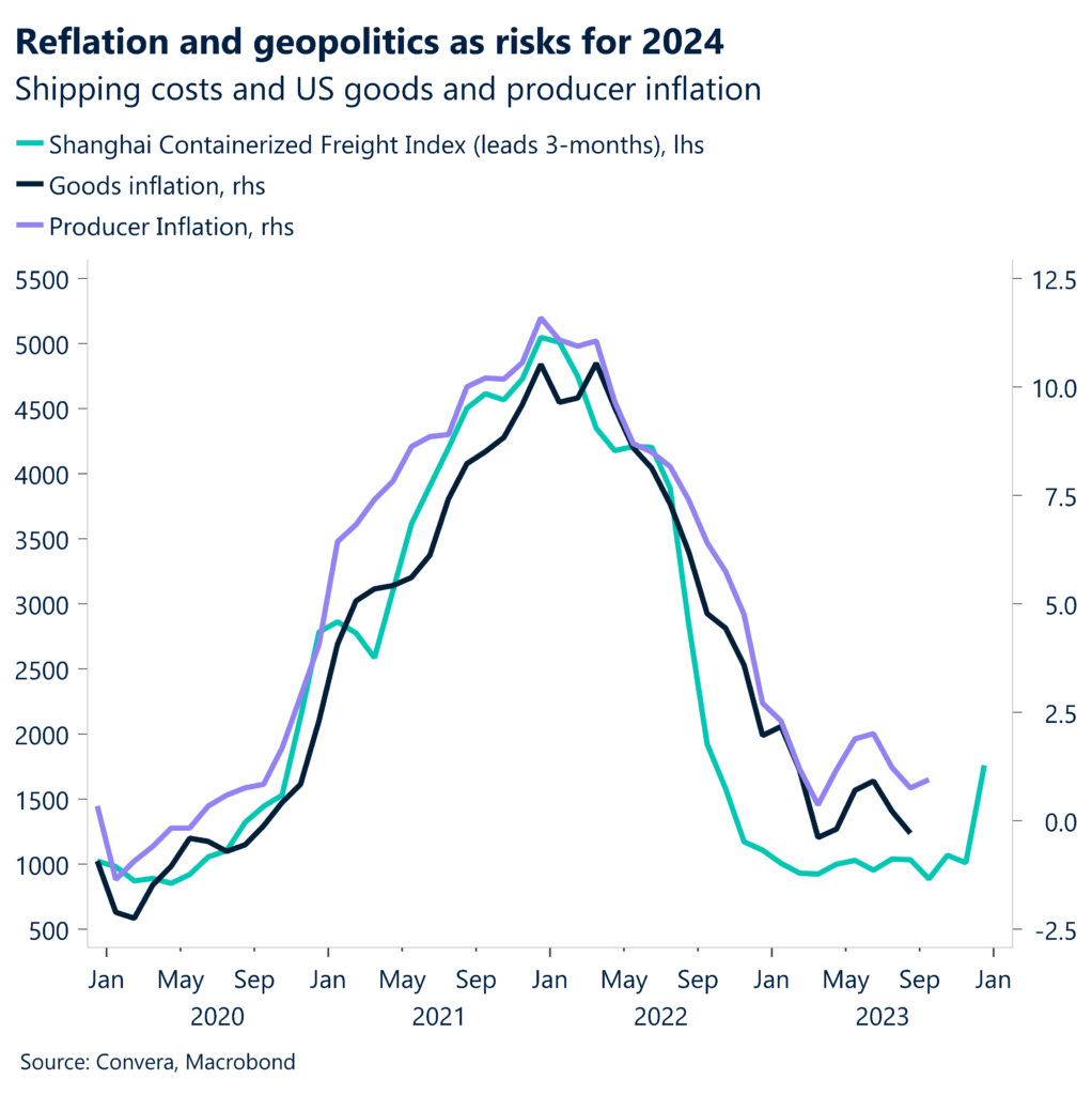 Shipping costs are rising. Markets are struggling to price in the implications of the US and UK launching strikes against Houthi rebels in Yemen, with the Iran-backed militia having already responded with confirmation of further escalations. This comes at a time when the conflict in the Red Sea has already put pressure on freight costs, which have been rising for some weeks now. This is the reason for why we have mentioned the reflationary scenario – inflation picking up over H1 – as one risk factor going into 2024. Especially against the backdrop of some leading indicators pointing to price and wage pressures starting to mount again.