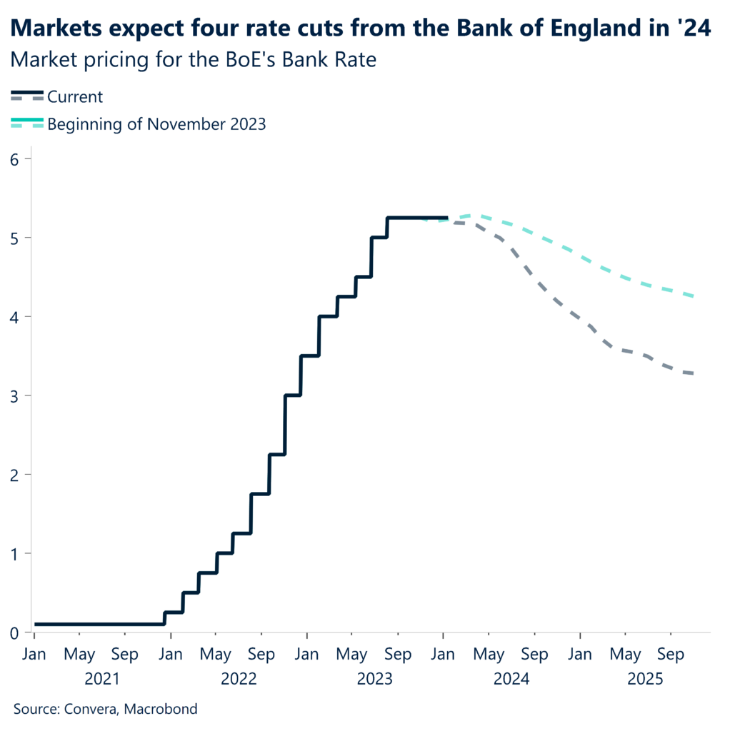Inflation fall to justify rate cuts in May. However, we do not think that the UK is in a fundamentally different position than the US or Eurozone and see inflation falling back to the 2% target of the Bank of England around the middle of the year. We see a high probability of the BoE having to revise down its inflation forecast at the monetary policy meeting in February. This assumption is both driven by the fall of energy prices over the past few weeks and falling inflation expectations from key UK surveys. This will have implications for how investors will price the BoE’s policy path for 2024. We expect the MPC to start the monetary policy easing cycle in March with a 25-basis point cut, which could be followed by three additional cuts over the course of the year.
