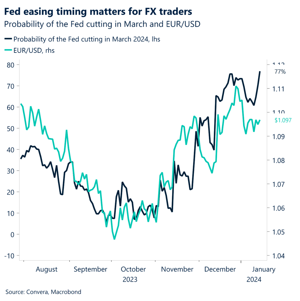 ECB pushes back against market pricing. The ECB is facing a tough dilemma during the January meeting in two weeks’ time over how early to start cutting rates when the economic outlook is fragile, and inflation remains above its 2% target. In parallel, Isabel Schnabel reinforced the message that the central bank remains data dependent and further evidence is needed before rate cuts can be discussed. Subsequently, markets downgraded their policy easing expectations are no longer pricing in a rate cut in the first quarter of 2024. Markets now see 145 basis points of rate cuts in 2024 with the first move coming in April, to be followed by a 25 basis point cuts at most if not all meetings this year.