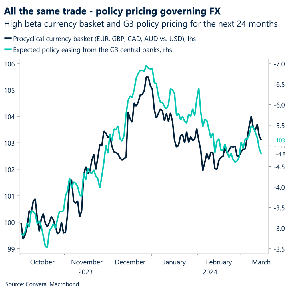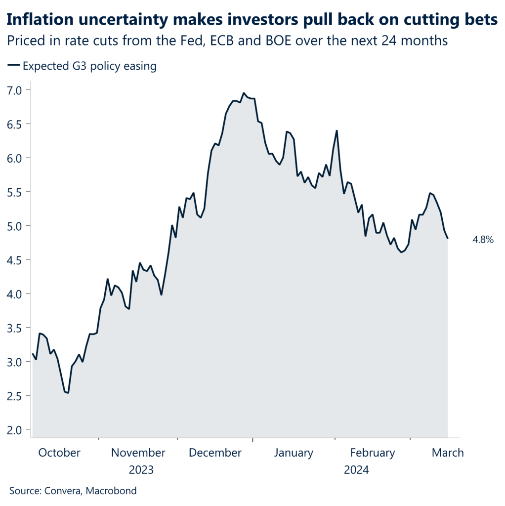 Setting the scene. The less market moving decision in Norway should see no change to policy rates as well. However, the decision in Switzerland could be a close call between leaving policy unchanged and cutting rates. In Asia, the Japanese and Australian central banks will be closely watched. The year started out with investors expecting the Federal Reserve to cut interest rates in March. However, the recent macro and inflation data has postponed these expectations to June. Next week will therefore be about setting the scene for a potential cut from the G3 central banks in Q2.