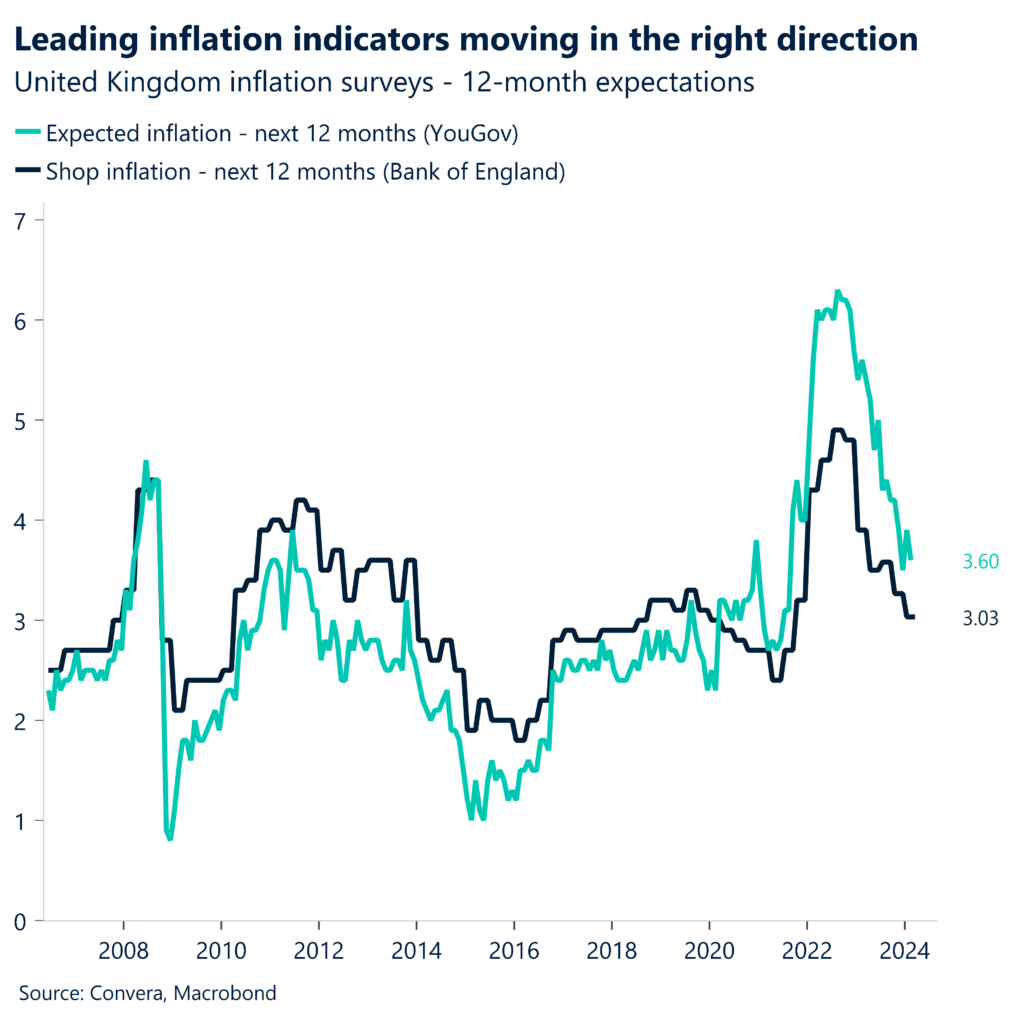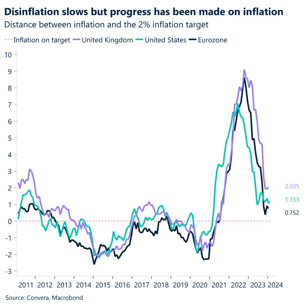Our constructive view sees inflation convergence to 2% in both the Eurozone and UK in some months. Expect the Fed, ECB and BoE to cut interest rates in June.