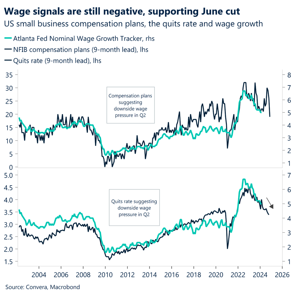 Wages to continue descent. Flying under the radar, but arguably more important, was the NFIB survey of small businesses, which offered investors some relief as the compensation plans of companies – a leading indicator for wage growth and therefore inflation – ticked down to its lowest since the beginning of 2022 in February. While the Q1 reflation has dampened hopes of a March or May rate cut, June is still seen as the beginning of the easing cycle.