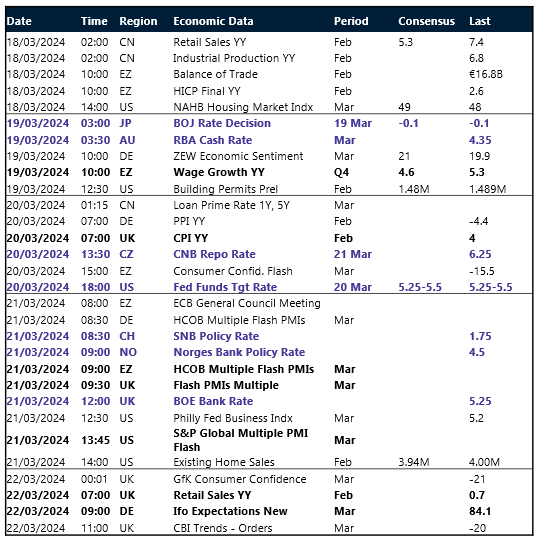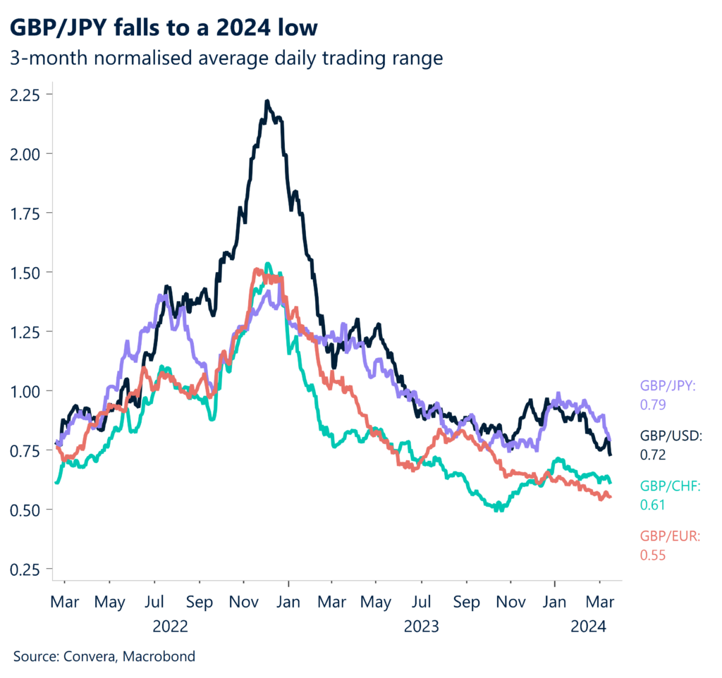 GBP Overall G3 easing bets steering sterling. After its biggest weekly advance of 2024 last week, the British pound has fallen around 1.3% from its 7-month high of $1.2893 versus the US dollar. GBP/USD failed to hold above its 200-week moving average but remains in positive territory year-to-date. US data was the main driver of this week’s trends, whilst domestically we saw UK wage growth pressures continue to ease, though policymakers will be looking for more progress before cutting interest rates. UK GDP rebounding in January supports the BoE’s stance for rates to stay restrictive for longer too. Given the expected path of monetary policy isn’t too dissimilar amongst the G3 central banks, we think the overall extent of monetary easing is more important now. The more rate cuts are being priced in, the better the growth prospects for high beta currencies, like the British pound, versus the US dollar. Thus, despite a hawkish repricing of UK rates seen this week, the overall hawkish repricing of G3 policy has hurt the pound. Next week, UK inflation and the BoE’s policy decision are key events for GBP traders, though no change to rates or forward guidance is anticipated.