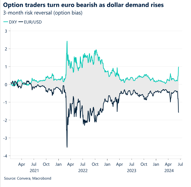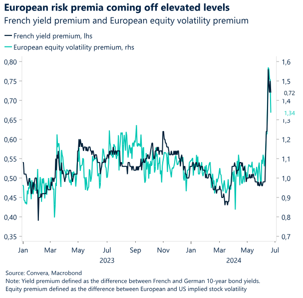 Las primas de riesgo político en Europa han caído ligeramente esta semana a medida que los inversores continúan midiendo la probabilidad de que los partidos de extrema izquierda o extrema derecha obtengan la mayoría absoluta en las elecciones generales francesas de este mes. Sin embargo, la volatilidad implícita sigue siendo elevada.