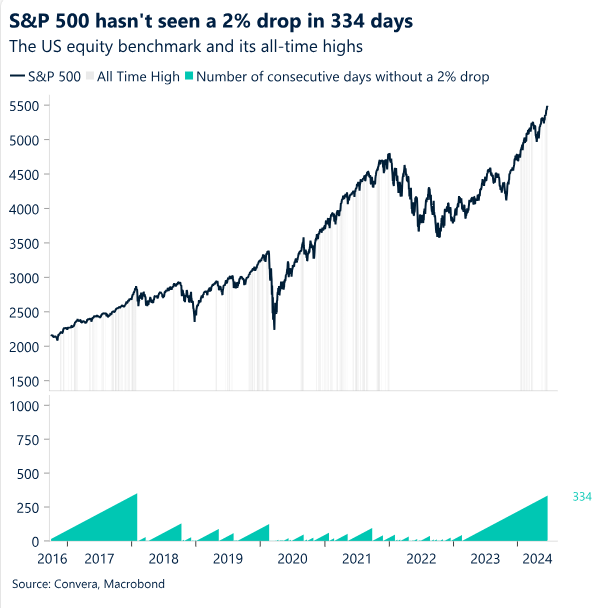 El descenso de los rendimientos y la desinflación han impulsado los índices de referencia de la renta variable estadounidense hasta máximos históricos. Así las cosas, el S&P lleva 322 días sin experimentar una caída del 2%, la racha más larga desde 2017-2018.